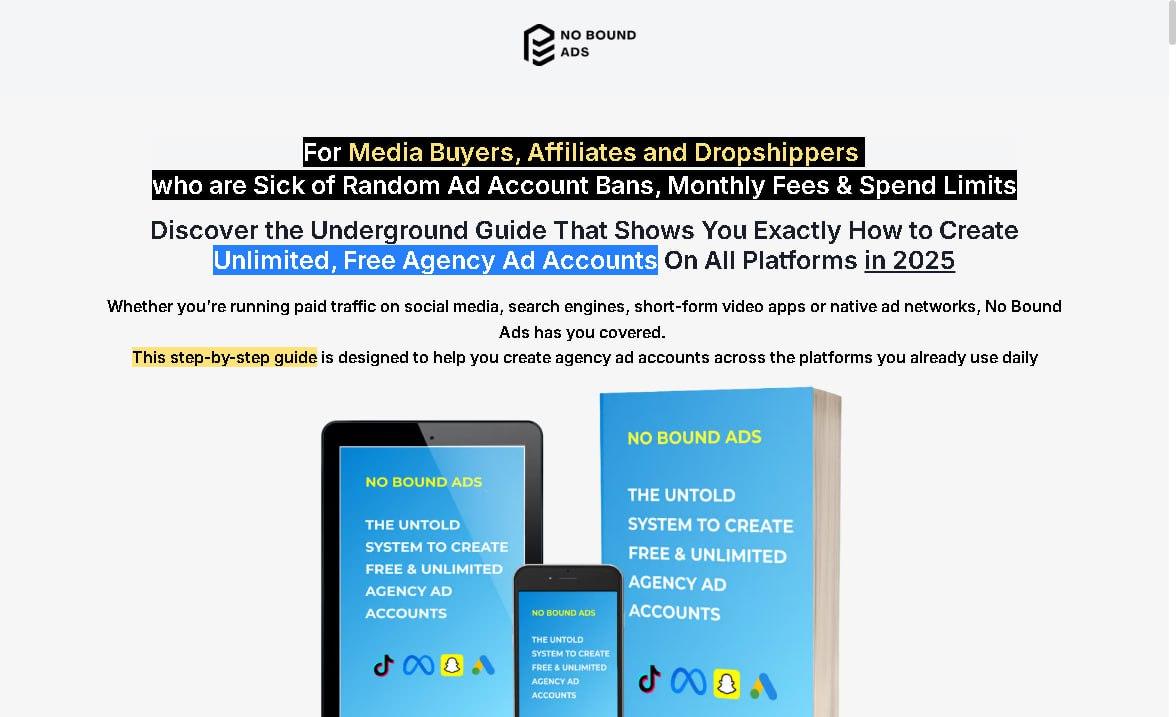 The No Bound Ads Full Bundle gives you the exact underground system to create unlimited, free agency ad accounts across Meta, Google, TikTok, Snapchat & more — even in 2025.